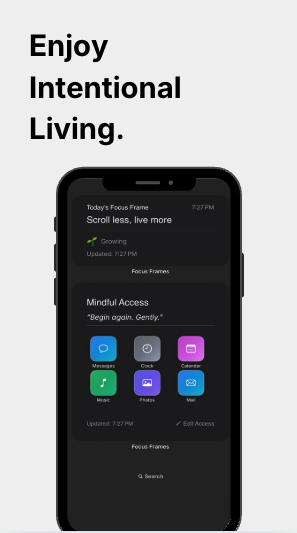 - The app's marketing—via getfocusframes.com—frames it as a "mindful launcher" helping users transform their phone experience: from chaotic and distracting → to clean, intentional, and focused
