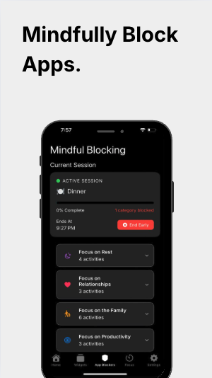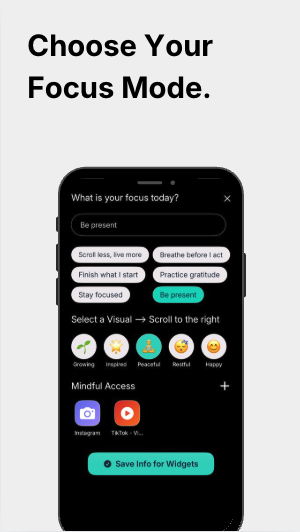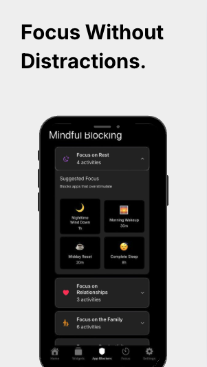 Smartphones are designed for distraction with endless notifications and app-hopping. Users needed a simple, non-intrusive way to build healthier phone habits without complex setups or blanket restrictions—just intentional, mindful phone use.